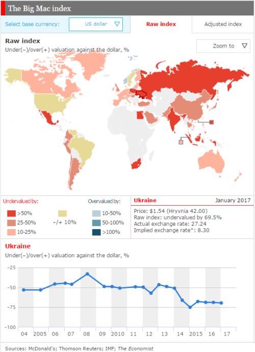 Відповідно до нового рейтинга The Big Mac Index, українська гривня недооцінена на 69,5%, відповідно долар повинен коштувати 8,3 гривні.