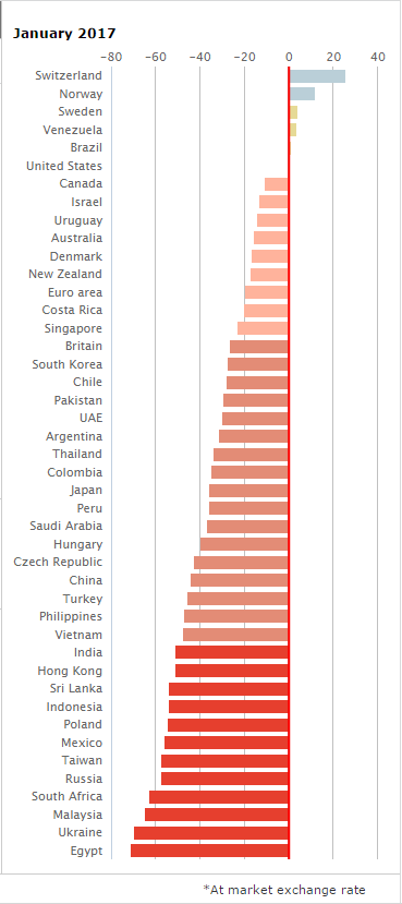 У січні 2017 року Біг Мак, який береться за еталон, в американських McDonald`s коштував $5,06. У порівнянні з бенчмарком найбільш переоціненою валютою став швейцарський франк: його курс завищений на 25,5% при вартості Біг Мака в $6,35. Ще однією країною, де курс національної валюти завищений, стала Норвегія. Виходячи з того, що Біг Мак там коштує $5,67, крона переоцінена на 12%.